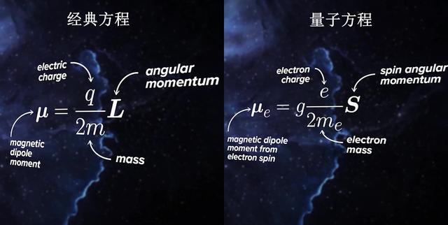 對于旋轉電荷,這取決于物體的角動量、電荷和質量,這是非量子旋轉電荷的經典偶極矩方程(下圖)。但是電子具有量子自旋,它的偶極矩與經典偶極矩不同,還要乘以一個g因子。對于電子來說,g的值大約為2,因此電子對外部磁場的響應強度是等效經典旋轉電荷的兩倍。量子電動力學可以準確地告訴我們電子的g值是多少,為了理解這一點,我們需要看一下QED中的圖。