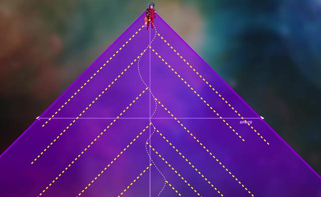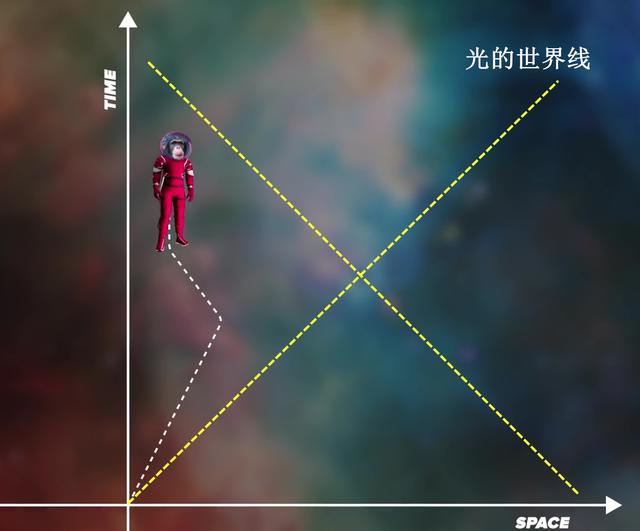 要理解這一點,我們只需要一點狹義相對論和時空圖。時空圖有兩個軸:時間軸和空間軸,我們可以使用圖上的世界線來顯示對象在空間和時間上的路徑。對于一個具有恒定速度的物體,它的世界線是一條直線,斜率可以反映出它的運動速度,而一個不動的物體它的世界線是垂直的。由于光只能以光速前進,所以它在圖上是一些與垂直軸成45度的線。