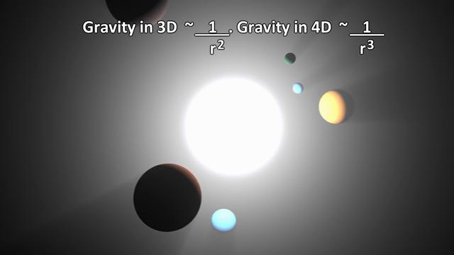 我們沒有看到四個或五個大空間維度的一個原因是,生命不能存在于三個以上的大維度中。為什么呢?因為圍繞恒星的穩定橢圓軌道不可能超過三個維度,添加的維度越多,引力就越弱。例如,在四個空間維度中,引力隨距離的倒數立方而變化,而不是距離的平方。結果,即使是很小的擾動(例如其他行星的引力),也會使繞太陽運行的地球要么朝向太陽中心,要么螺旋形遠離太陽。沒有穩定橢圓軌道意味著沒有太陽系,也可能沒有生命。因此,生命大概不可能存在。