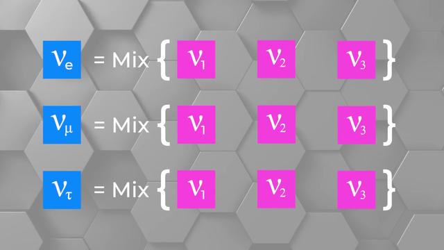 中微子在標準模型的粒子中是獨一無二的,因為它們實際上可以改變身份。這種特殊的行為,稱為中微子振蕩,它可以解釋兩個實驗帶來的困惑。首先,太陽釋放出大量的電子中微子,但撞擊地球的電子中微子比理論預期的要少。其次,來自外太空的質子猛烈撞擊地球大氣層,理論預測以二比一的比例產生μ子中微子和電子中微子,但實驗觀察到的比例是一比一。 有三種不同味道的中微子——電子中微子、μ子中微子和τ中微子。順便說一句,我們用希臘字母υ和一個下標來表示中微子的味道。我們不知道中微子的確切質量,但它們具有三個質量本征態:υ1、υ2和υ3。我們知道υ1和υ2的質量相似,而υ3則完全不同。你可能會認為電子中微子可能與υ1、υ2或υ3相同,但事實并非如此。每個電子、μ子或τ中微子都是三種不同質量本征態的中微子的混合體。