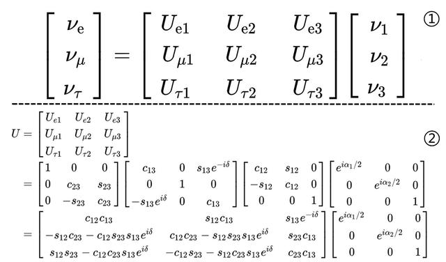 基本上,這是一個量子力學的東西,它和薛定諤的貓沒什么不同。薛定諤的貓在一個盒子里,盒子里有一個放射性原子、一個探測器、一個毒氣瓶和一把錘子。當原子衰變時,錘子會掉落并砸碎小瓶。如果你不打開盒子,你就無法知道原子是否衰變了,所以原子既是衰變的又是未衰變的,因此貓在你打開盒子之前既是活的又是死的。中微子也是一樣,例如一個電子中微子可能同時具有 υ1、υ2和υ3的質量,只有當你測量中微子的質量時才能真正確定它。 事實上,我們可以進一步把中微子味道與質量本征態用一個矩陣來聯系,如下圖第一部分所示。當考慮到標準的三中子理論時矩陣為3×3,這也被稱為PMNS矩陣。我們進一步對PMNS矩陣進行處理,得到下圖第二部分的內容,其中sij=sin(θij),cij=cos(θij)。
