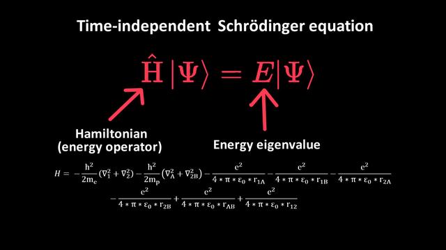對我們來說一些最重要的化學物質,比如我們呼吸的空氣,不是由單個原子組成,而是由分子組成。例如,空氣中的氧不是單獨的氧原子,而是兩個結合在一起的氧原子。 一個氫原子僅由一個質子和一個電子組成,電子在原子核周圍形成了云,這種云的形狀由包含波函數的薛定諤方程決定。簡單來說,如果我們要測量它的性質,波函數代表了可能結果的概率。 整個系統發生的事情是由系統的總能量決定的。要計算這兩個原子系統的最低能量,我們必須考慮以下因素:每個原子的動能、兩個質子之間的勢能、兩個電子之間的勢能以及每個電子與每個質子之間的勢能。在量子力學中,整個系統的動能和勢能的可能結果的總和被稱為哈密頓量,用大寫字母H表示。當我們進行所有計算時,我們的2原子氫系統的哈密頓量如下圖所示。