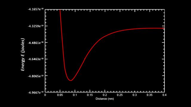 需要明確的是,哈密頓量是對應于系統能量的算子,一旦將其代入與系統無關的薛定諤方程,就可以求解以獲得可能的能量值。然而,這不是一個簡單的方程,但為簡單期間,它可以用下圖表示,橫坐標表示距離,而縱坐標表示能量。當系統從右到左移動時,表示兩個原子從遠離到靠近,此時能量會先下降然后再上升。因此,兩個原子找到了一個自然的甜蜜點,這樣它們在一起時就快樂地處于較低的能量狀態。