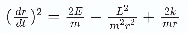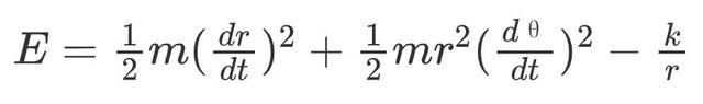 行星軌道方程在這里,我們要寫出極坐標下的行星能量方程和角動量方程。 請注意,在極坐標下,速度包含了兩部分:平行r方向的速度和垂直r方向的速度。因此,我們可以列出能量方程=動能 勢能: