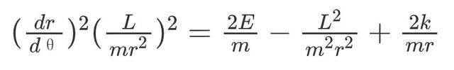 注意,這里還要用到一個常用的技巧:令u=1/r,這會使數學計算更容易一點。這里我們就不給出繁瑣的計算過程,直接給出最終的軌道方程:
