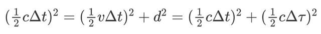 狹義相對論有兩個(gè)重要的假設(shè):相對性原理和光速不變原理,我們將從這些原理出發(fā),設(shè)計(jì)一個(gè)思想實(shí)驗(yàn),來推導(dǎo)時(shí)間膨脹公式。 在火車上的人們,看到激光是直上直下的,他們算得整個(gè)過程所花費(fèi)的時(shí)間是Δτ=2d/c。但是,在火車之下的地面觀察者,由于火車的運(yùn)動,他們看到的光線呈鋸齒狀,斜向上發(fā)射而后斜向下反射。假設(shè)地面觀察者測得的時(shí)間間隔為Δt,根據(jù)光速不變原理和勾股定理,我們可以得到如下公式: