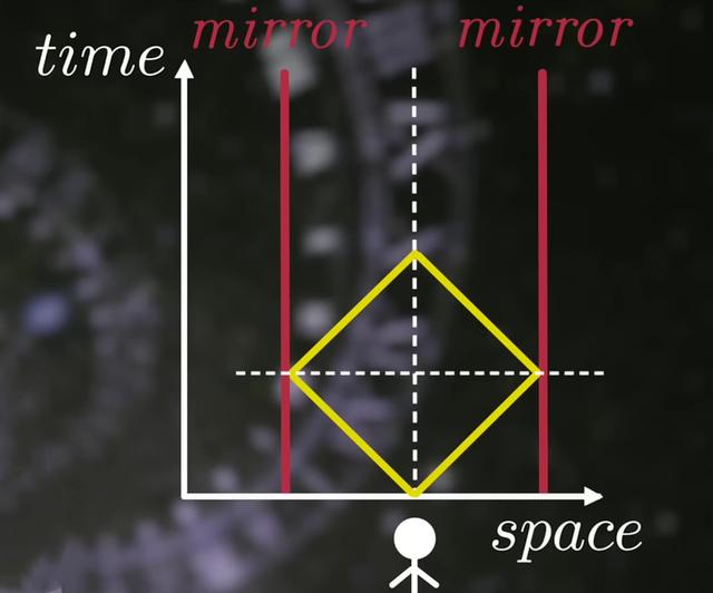 我們可以在直角坐標(biāo)系中畫出時(shí)間維度:一條用于時(shí)間,另一條用于至少一維空間,這稱為時(shí)空圖。如果只是靜止不動,那么在此類圖中的運(yùn)動是豎直的直線;如果以恒定的速度移動,那么在圖中是一條以一定角度傾斜的直線。最大的速度是光速,按照慣例它通常以45度角繪制。在空間中我們可以前后、左右或上下移動。但隨著時(shí)間的推移,我們只能向前,不能掉頭往后走。所以時(shí)間仍然在某些方面與空間不同。 光速是有限的,沒有什么比光速更快。你可能正在手機(jī)屏幕前看這篇文章,那么“現(xiàn)在”你的手機(jī)還在嗎?你的答案是肯定的,但物理學(xué)家可能會指出,實(shí)際上你并不知道,因?yàn)椤艾F(xiàn)在”手機(jī)發(fā)出的光還沒有到達(dá)你的眼睛。如果有人搶走了你的手機(jī),那么手機(jī)丟失的信息需要一小段時(shí)間才能到達(dá)你的大腦,那么你怎么會知道“現(xiàn)在”手機(jī)在哪里呢? 愛因斯坦的思想實(shí)驗(yàn)做到了這一點(diǎn),假設(shè)在我們左邊和右邊各放一面鏡子,之后同時(shí)向左右兩面鏡子各發(fā)射一個(gè)光子。因?yàn)槲覀冇泄馑俨蛔冊恚晕覀冎雷笥覂蓚€(gè)光子必須同時(shí)返回。最后一步,在整個(gè)過程所需的時(shí)間的一半時(shí),我們就知道光子一定是從鏡子上反彈回來的。現(xiàn)在,我們可以說這個(gè)時(shí)刻就是所謂的“現(xiàn)在”了,即使光還沒到達(dá)我們這里。時(shí)空圖中的表現(xiàn)形式如下圖。