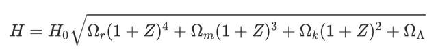 現在,計算宇宙年齡的關鍵就在于哈勃常數,我們可以通過一系列操作把它變成是a的函數。通過考慮弗里曼方程,我們可以將哈勃常數寫成如下紅移的形式:
