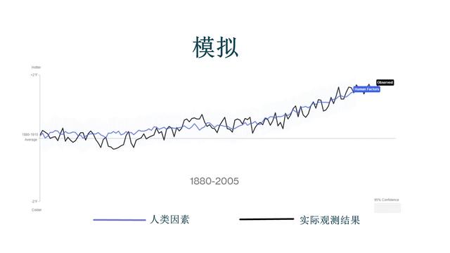還有些人覺得,變暖是不是地球的自然氣候周期?根據冰芯證據,我們知道在上一個冰河時代結束時,地球以平均每100 年約0.06攝氏度的速度變暖。但我們今天看到的至少是這個增幅的10倍。當僅使用氣候變化的自然原因進行模擬時,他們預測20世紀溫度不會發生變化,甚至會出現輕微的降溫。但當我們加入人造源排放造成的非自然影響時,它與我們現在觀察到的結果更為接近。如果我們將自然效應與非自然效應結合起來,模擬幾乎完全符合測量數據。