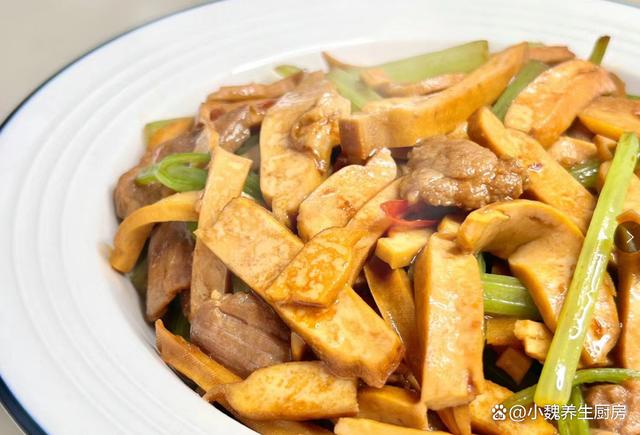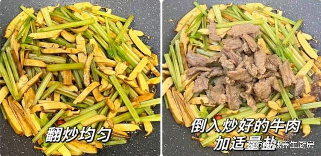 第八步:倒入芹菜段炒至斷生,倒入提前炒熟的牛肉片,調入半勺老抽和生抽,加上一丟丟白糖和食鹽,用鍋鏟翻炒均勻,裝盤出鍋,這道香芹豆干炒牛肉絲就可以開吃了。 香芹豆干炒牛肉絲是一道特別開胃的菜肴,主要選用香芹,豆干和牛肉烹飪而成,菜色非常好看,豆干特別鮮嫩爽滑,牛肉的肉質非常鮮嫩,能夠為身體儲備一些能量,趕快給家里人做一做。 你們是否掌握這道香芹豆干炒牛肉絲的正確做法呢?(文中配圖均出自網絡)