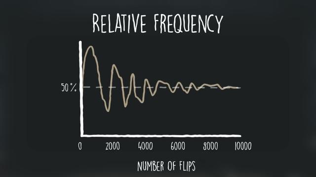 現代人生活節奏非常快,沒有足夠的空閑時間拋硬幣10000次,但我們可以用計算機進行模擬。并且每次模擬我們都能看到相同的模式,正面出現的相對頻率總是在50%左右。這不僅僅是硬幣的一個特征,對于骰子它落在每個面上的幾率是六分之一或16.67%。如果我們投擲10000次的骰子,我們會發現每個面出現的相對頻率接近于16.67%。