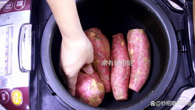 接下來,我們直接將扎好洞的紅薯放置在電飯煲的內膽中就可以了,不需要加水,也不需要放油。可能很多朋友會擔心電飯煲內沒有水,會導致電飯煲損壞,其實這個擔心是多余的,現在的都是智能電飯煲,它是有溫控系統的,當電飯煲內部的溫度達到一定程度時,它就會自行斷電,并不會一直加熱。而且紅薯中有一定的水分,并不用擔心電飯煲會被損壞。