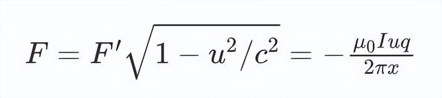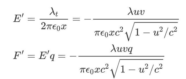 想象一下,我們有一根導線和一個帶電粒子,粒子的速度為u。 現在,我們把參考系和導線外的帶電粒子綁定在一起。在這個參考系下的觀察者會看到,正電荷的移動速度大小v 與負電荷的移動速度大小v-不同,因此兩個正電荷之間的距離與兩個負電荷之間的距離不同,導致正電荷的線密度λ 就與負電荷的線密度λ-不同。所以,導線的橫截面就會有凈電荷產生,會對導線外的帶電粒子產生靜電力。