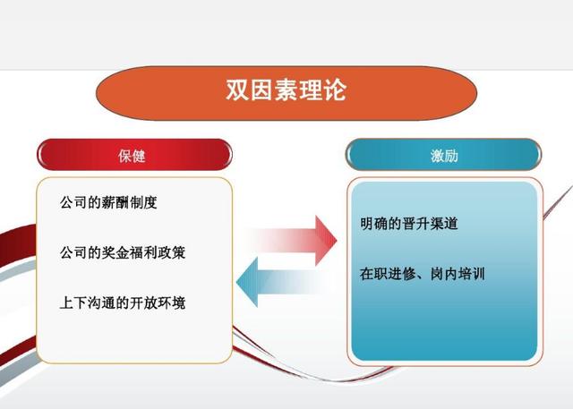 保健因素的內(nèi)容: 保健因素的內(nèi)容包括公司的政策與管理、監(jiān)督、工資、同事關(guān)系和工作條件等。這些因素都是工作以外的因素,如果滿足這些因素,能消除不滿情緒,維持原有的工作效率,但不能激勵(lì)人們更積極的行為。 激勵(lì)因素與工作本身或工作內(nèi)容有關(guān),包括成就、贊賞、工作本身的意義及挑戰(zhàn)性、責(zé)任感、晉升、發(fā)展等。這些因素如果得到滿足,可以使人產(chǎn)生很大的激勵(lì),若得不到滿足,也不會(huì)像保健因素那樣產(chǎn)生不滿情緒。