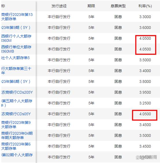 利率超4%的大額存單哪里有?大額存單不像是定期存款,只要想存都能存。想要存大額存單,首先得看銀行是否有大額存單發行,其次就是看發行的大額存單是否還有額度。如果沒有發行或者沒有額度,就算錢再多也買不了。 按照當前的利率水平,利率能超過4%的大額存單,只有可能是五年期的。而大銀行一般很少會發行五年期的大額存單,只有一些中小銀行才有。所以,利率能超4%的大額存單,肯定得去中小銀行找。 不過,并不是只要是中小銀行的五年期大額存單,利率都能達到4%以上。事實上,哪怕是中小銀行,也只有少數銀行的五年期大額存單利率能超4%。