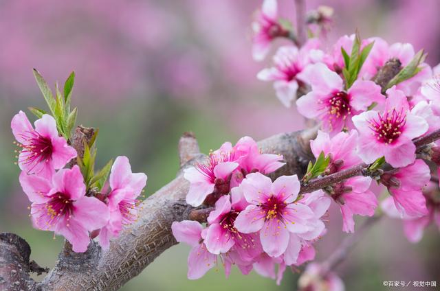 二、桃花的色彩之韻 桃花的色彩是其最為引人注目的特點之一。它的花瓣顏色豐富多彩,有淡粉色、深粉色、紅色、白色等多種。其中,粉紅色桃花最為常見,它們如同少女的臉頰般嬌艷欲滴,給人以溫馨和浪漫的感覺。紅色桃花則更加熱烈奔放,仿佛燃燒的火焰,充滿了生命力和活力。白色桃花則顯得清新脫俗,如同雪花般純潔無瑕,給人以寧靜和清新的感覺。 桃花的色彩之韻不僅僅體現在花瓣上,還體現在它的樹干和葉片上。灰褐色的樹皮和翠綠的葉片與多彩的花瓣形成了鮮明的對比,使得桃花的整體色彩更加和諧而富有層次感。