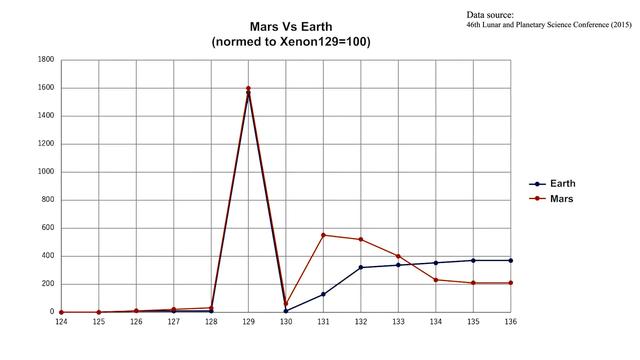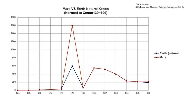 為什么?核武器試驗(yàn)。每當(dāng)核武器引爆時(shí),都會(huì)產(chǎn)生大量自然界中沒有的氙同位素, 氙129就是其中之一。上圖顯示了1945年之前火星大氣和地球大氣中的氙同位素?cái)?shù)量。火星的氙129的數(shù)量達(dá)到了1600的水平,而1945年之前地球只有 600。由于核爆炸,地球大氣層的氙129含量急劇增加,達(dá)到與火星相同的水平,如下圖所示。