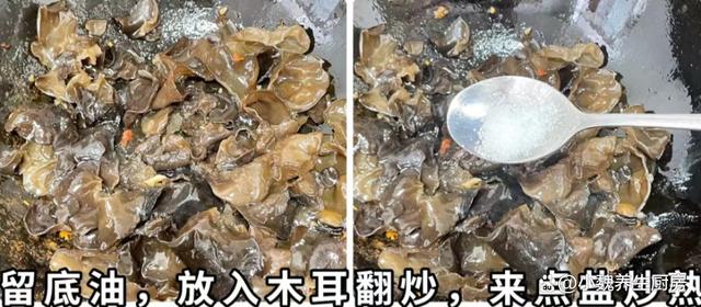 第五:鍋中繼續加上油,放入小米辣和蒜末,放入一些肥肉煸炒出油脂,倒入瘦肉絲煸炒至變色,將其盛出備用。 第六:鍋中繼續加上油,油溫慢慢燒熱,放入蒜末炒香,倒入黑木耳大火翻炒,加上一丟丟食鹽,加上半勺白糖,用鍋鏟翻炒均勻。