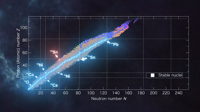 對于較小的原子核(原子序數(shù)最多為 20),質(zhì)子和中子的均勻分布通常是最穩(wěn)定的。但對于較重的元素,需要越來越多的中子來提供緩沖,達(dá)到1.5或更高的中子與質(zhì)子比。但這只是穩(wěn)定性理論的一部分,它沒有解釋為什么單個中子的差異可能意味著穩(wěn)定性的巨大差異,它也沒有解釋為什么锝?jīng)]有穩(wěn)定同位素。 那這是否可以解釋锝的不穩(wěn)定性?當(dāng)然,我們可以看出43不是質(zhì)子的幻數(shù),但是它附近的奇數(shù)元素,如47個質(zhì)子的銀,具有非常穩(wěn)定的同位素。即使給锝一個特定的中子數(shù)使它核子數(shù)為偶數(shù)也不濟(jì)于事,例如,锝-96會在不到一小時內(nèi)衰變。所以除了中子填充、核殼填充和自旋耦合之外,似乎還有更多神秘的力量在起作用。 當(dāng)我們將實(shí)驗(yàn)數(shù)據(jù)與我們的模擬相結(jié)合時,我們可以制作這樣的圖表,在這里我們可以看到這些幻數(shù)。質(zhì)子數(shù)為幻數(shù)的元素具有更穩(wěn)定的同位素,而中子數(shù)接近幻數(shù)的元素往往有更多的同位素。模式出現(xiàn)了,但并沒有為我們提供產(chǎn)生穩(wěn)定核所需條件的清晰規(guī)則。