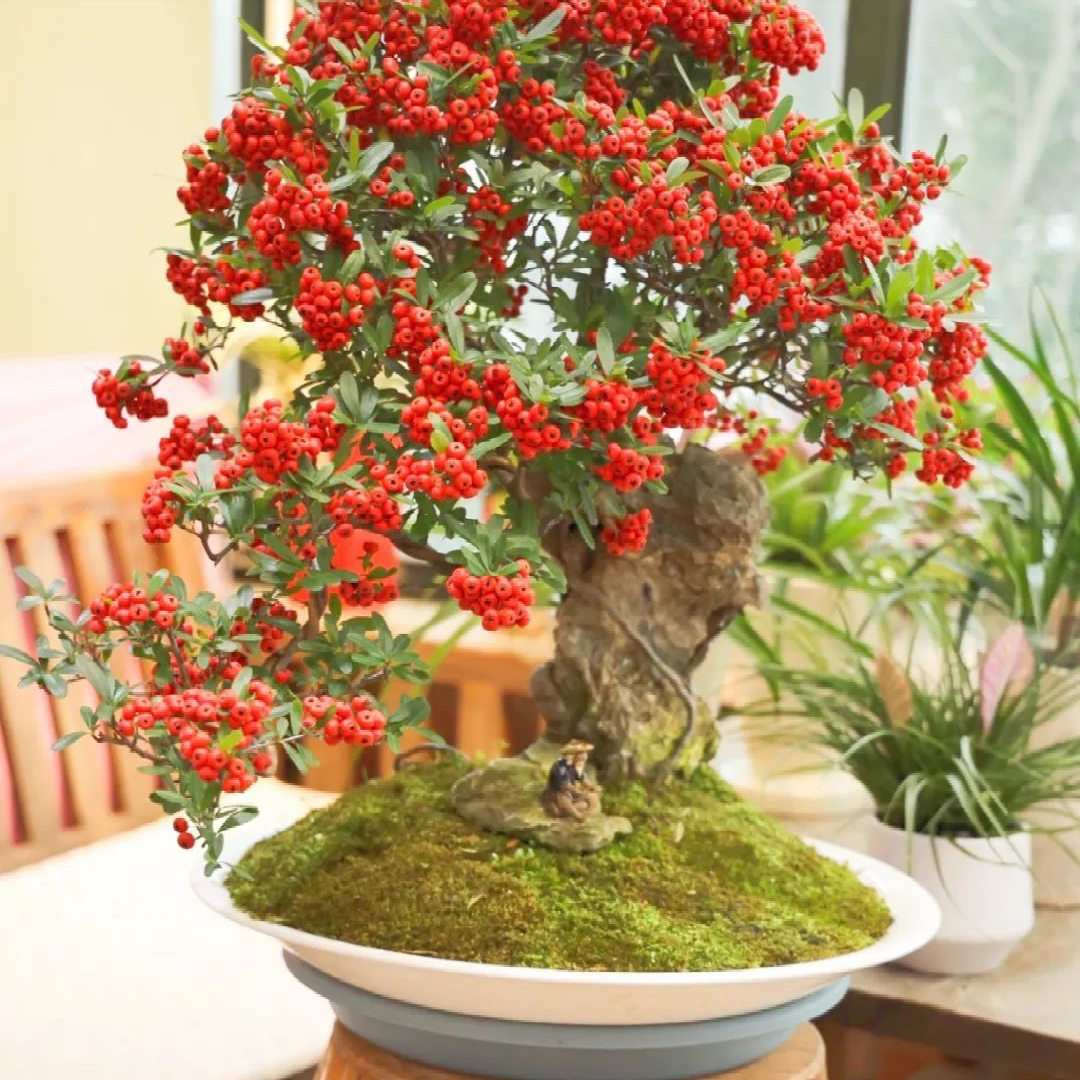 在風水學中,火棘因其四季常綠、果實眾多的特性,常被認為象征著生命力旺盛和豐收的吉祥物。紅色的果實還被認為能夠帶來好運和喜慶,因此,火棘盆景常被人們放置在家中或辦公室以期望帶來好運和正能量。 |
