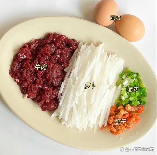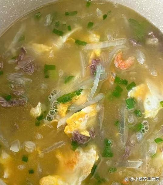 11月到了,感覺(jué)今年過(guò)得特別快,前段時(shí)間才過(guò)國(guó)慶假期,轉(zhuǎn)眼就到了深秋,深秋是秋季的尾聲,距離冬天越來(lái)越近,氣溫特別陰冷潮濕,身體不舒服,嗓子非常干燥,很容易上火,抵抗力很差。每年到了季節(jié)交替的時(shí)候,我們不能天天吃大魚(yú)大肉,平常可以多喝一些鮮美的家常湯品,比如說(shuō)這款蘿卜絲牛肉煎蛋湯,主要選用白蘿卜,牛肉和雞蛋烹飪而成,保留幾種食材的最大營(yíng)養(yǎng)價(jià)值,簡(jiǎn)單燉一鍋,好喝不油膩。“11月多喝湯,郎中不用幫”,多給家人喝這湯,補(bǔ)足營(yíng)養(yǎng)迎接寒冬。  【蘿卜絲牛肉煎蛋湯的詳細(xì)做法】 食材清單:選購(gòu)新鮮白蘿卜一個(gè)(或者選擇櫻桃蘿卜,蘿卜的水分很豐富,稍微有一點(diǎn)甜度,打霜后的蘿卜更好吃,具有一定的食療效果,一般用來(lái)炒著吃,或者用來(lái)煮湯,讓湯汁更加鮮美),挑選半斤優(yōu)質(zhì)牛肉里脊,新鮮土雞蛋2個(gè)(土雞蛋的蛋黃不容易散,營(yíng)養(yǎng)價(jià)值更高,怎么吃都好吃),食用油若干,4根小蔥,生姜3片,優(yōu)質(zhì)蝦干35克左右,開(kāi)水和冷水少許,少許紅薯淀粉,原味醬油少許,蠔油一勺,食鹽若干,胡椒粉一小勺,其他佐料。 正確制作順序: 第一:提前準(zhǔn)備好新鮮牛肉,雞蛋,蝦干和白蘿卜,白蘿卜的外皮洗干凈,削皮洗凈切成細(xì)絲,蘿卜絲可以用鹽水浸泡,最后控干表面的水分。第二:將蝦干用溫水泡發(fā)好,幾片生姜切成細(xì)末,香蔥切成若干小蔥花,把牛肉去掉一層筋膜,反復(fù)洗干凈,將牛肉逆紋路切片,然后切成一些片狀。 第三:將牛肉放入容器中,加上一勺半紅薯粉,加上生抽和蠔油各一勺,加上少許食鹽,調(diào)入胡椒粉半勺,用手迅速抓拌一會(huì)兒,滴入一些輔食油,鎖住牛肉的營(yíng)養(yǎng),靜置20分鐘左右。 第四:將鍋底燒熱,鍋中加上食用油,打入幾個(gè)土雞蛋,讓雞蛋快速定型,煎至兩面成型,分成若干小塊,雞蛋塊盛出備用。 第五:鍋底留少許油,加上姜末,蔥花和蒜末炒香,倒入一些蝦干,爆炒出香味來(lái)。