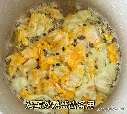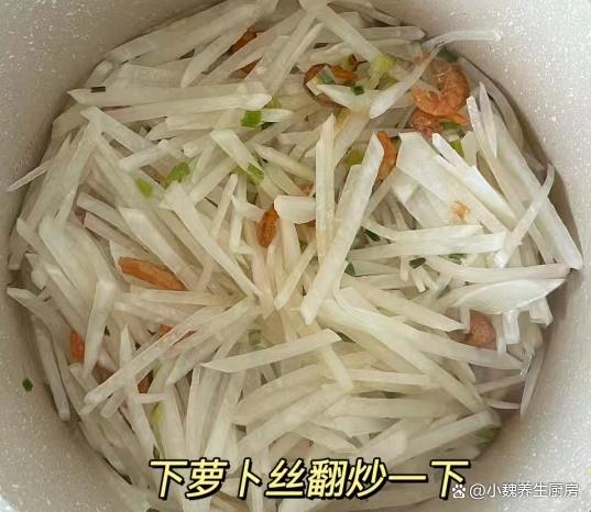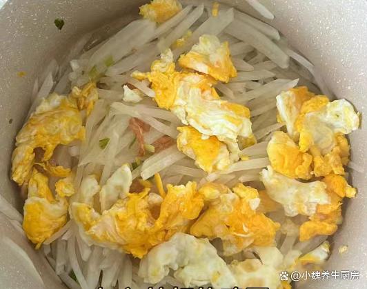 第六:倒入一些白蘿卜絲,將其炒至變軟,放入之前煎好的雞蛋,加上適量開(kāi)水,蓋上鍋蓋將其煮沸。