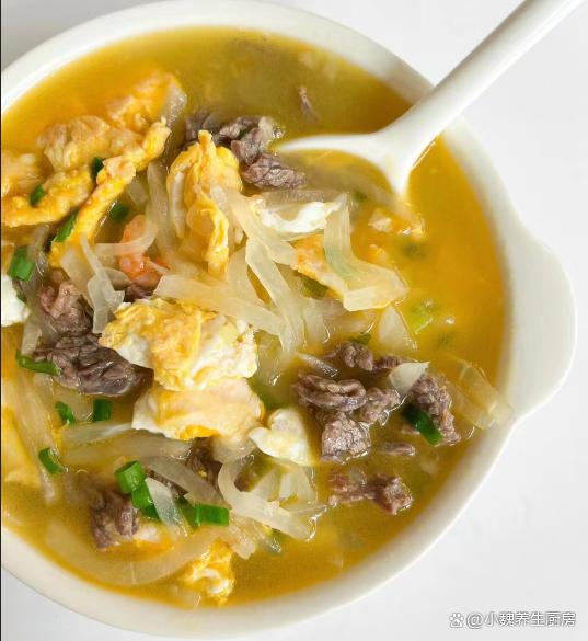 第七:大概煮4分鐘左右,讓湯色慢慢變黃,最后下入腌制好的牛肉,讓牛肉片燙熟至變色,記得不要煮太長(zhǎng)時(shí)間。 第八:出鍋之前加上一丟丟食鹽,半勺白胡椒粉,丟入蔥花點(diǎn)綴即可,這款蘿卜絲牛肉煎蛋湯就烹飪完成了,11月一定不能忘記喝它。 蘿卜絲牛肉煎蛋湯是一款鮮美甘甜的進(jìn)補(bǔ)湯,深秋來(lái)臨以后,氣溫驟降,嗓子容易干啞,身體十分虛弱無(wú)力,需要為秋冬儲(chǔ)存能量,可以多喝這款蘿卜絲牛肉煎蛋湯,湯汁鮮美,牛肉超級(jí)嫩滑,補(bǔ)充優(yōu)質(zhì)蛋白質(zhì)和鐵元素,潤(rùn)肺去燥,一整年少生病。
