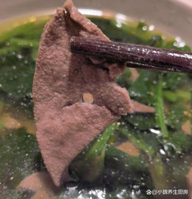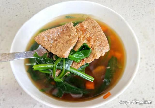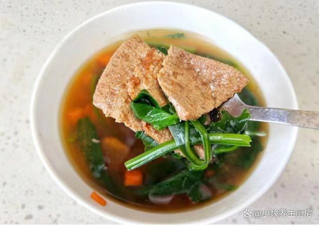 第二步:切掉豬肝多余的部位,豬肝要逆著紋路切片,豬肝片放在容器里,加上一勺玉米淀粉,加上一勺料酒去腥,放入生姜絲,加上食鹽和胡椒粉,調(diào)入半勺生抽或老抽,用手快速抓拌均勻,腌制20分鐘左右。 第三步:將新鮮菠菜的根部和葉子切掉,起鍋煮一些熱水,將菠菜下鍋燙一會兒,去掉里面的草酸,撈出備用,胡蘿卜洗凈切成小丁。 第四步:鍋底調(diào)入少許食用油,放入姜絲和蔥白炒香,加上適量冷水煮開,煮沸后調(diào)到小火,將腌制好的豬肝下鍋。 第五步:豬肝不要煮太長時間,最后下入菠菜,加上一小勺味極鮮,加上食鹽,胡椒粉和其他佐料,燜煮一分鐘即可。 第六步:撒上蔥花點綴,關火盛出,這款胡蘿卜菠菜豬肝湯就烹飪完成了。 胡蘿卜菠菜豬肝湯是一款老少皆宜的湯品,菠菜屬于應季蔬菜,葉片富含多種微量元素,豬肝的鈣鐵營養(yǎng)物質(zhì),比牛肉高幾倍,搭配胡蘿卜和菠菜煮湯,湯汁鮮美倍增,營養(yǎng)更好消化,讓肝臟越來越健康,氣色越來越好,早食早受益。 小伙伴們,你們掌握這款胡蘿卜菠菜豬肝湯的烹飪技巧嗎?(文中配圖都來自網(wǎng)絡)
