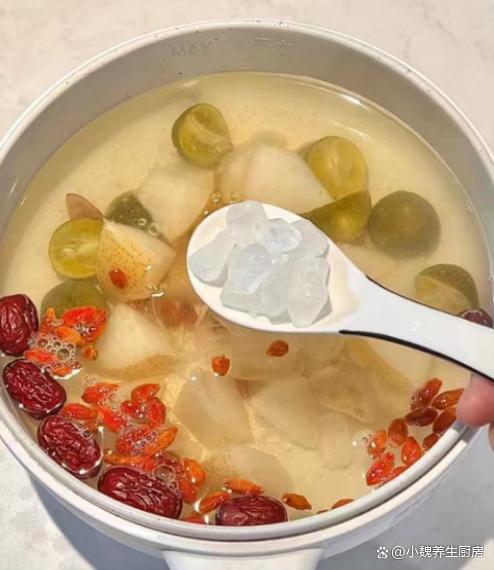 第五步:放入一些冰糖,小火繼續煮10分鐘,放入一些枸杞子,再次煮幾分鐘,關火盛出,這款雪梨金桔百合枸杞湯就制作完成了,秋冬季節一定要多喝它。 雪梨金桔百合枸杞湯是一款營養豐富的甜湯,被稱為天然“止咳湯”,主要選用金桔,雪梨和百合制作而成,嘴閥超級簡單,營養易消化,具有潤肺止咳,養陰潤燥的效果,每天喝一碗,補足營養,消除困乏,氣色越來越好。