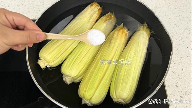 接下來直接把這個清洗干凈的玉米放入鍋中,然后往里面加入水,水稍微多倒點,把玉米完全淹沒。可能很多朋友這個時候就會開火來煮,但其實想要玉米煮的更好吃,那么還需要往里面加入關鍵的兩味——食鹽和小蘇打。先加入一小勺的食鹽,俗話說,“要想甜,加點鹽”,食鹽就可以很好的將玉米里的甜味激發出來。