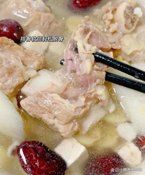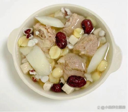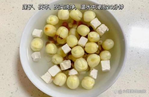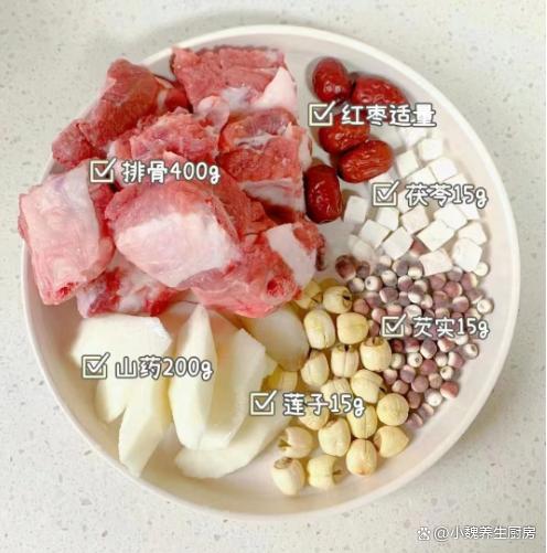 進入秋季的尾聲,才剛剛感覺到秋季的氣息,轉眼就到了霜降節氣,霜降節氣是秋季的最后一個節氣,是秋季與冬季的交替點,此時的氣溫逐漸降低,地表開始結霜,萬物逐漸進入休眠期,早上地表出現白色的霜,晚上水汽非常足,因此早晚溫差特別大,身體免疫力差,如果上了年紀,身體很容易生病和著涼。霜降節氣到來之后,我們也要遵循節氣的變化,注意增添衣物,飲食要多以湯湯水水為主,多喝暖和和的湯湯水水,比如說這款山藥茯苓蓮子排骨湯,我們家每周都喝它,暖胃又健脾,對身體好處多多。“霜降一碗湯,醫生不用幫”,秋冬多喝這湯,補足營養,增強免疫。  【山藥茯苓蓮子排骨湯的具體做法】 食材清單:選購新鮮排骨400-500克左右(排骨是多功能的食材,食用方法非常多,新鮮排骨肉質紅潤,可以做成許多美食,秋冬適合用來煲湯,排骨湯喝起來鮮美滋補,對身體有許多好處),茯苓和芡實各30克,挑選優質洪湖蓮子35克(蓮子是我們當地的特產,蓮子心可以入藥,蓮子肉可以用來煲湯和煮粥,發揮其安神的效用,平常可以多囤一點),新鮮山藥一根(大概200克左右),大紅棗若干個,少許冷水和溫水,少許黃酒,老姜少許,其他。 正確做法: 1:提前準備好新鮮排骨和其他食材,提前讓商販將排骨剁成小塊,排骨里面有一些血絲,用流水沖洗干凈,放入容器里,加上適量面粉,反復抓拌均勻,吸附掉臟東西,洗凈控干水分。2:山藥用刨子去掉外皮,清洗掉表面的黏液,斜切成厚一點的片狀,一些紅棗洗凈,去掉紅棗的內核。 3:茯苓和芡實,干蓮子放在容器里,加上適量溫水浸泡20分鐘,蓮子要取出內心,生姜去皮切成片,香蔥切成蔥段,備用。 4:湯鍋里放入一些排骨,加上足量冷水沒過排骨,記得加上姜片和蔥段,調入少許黃酒,把排骨焯水去腥,溫水沖洗表面的浮沫。