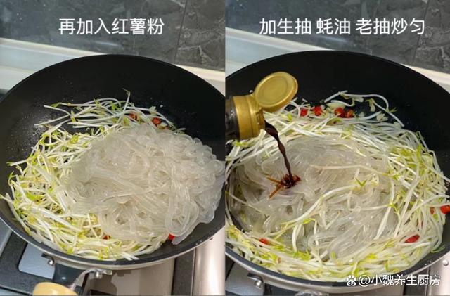 第七步:鍋中繼續加上油,放入一些蒜末和小米辣,大火快速煸炒,倒入豆芽菜炒至斷生。 第八步:然后放入紅薯粉絲,加上少許生抽和老抽,加上一勺蠔油,放入一些韭菜段和雞蛋,用鍋鏟翻炒均勻。