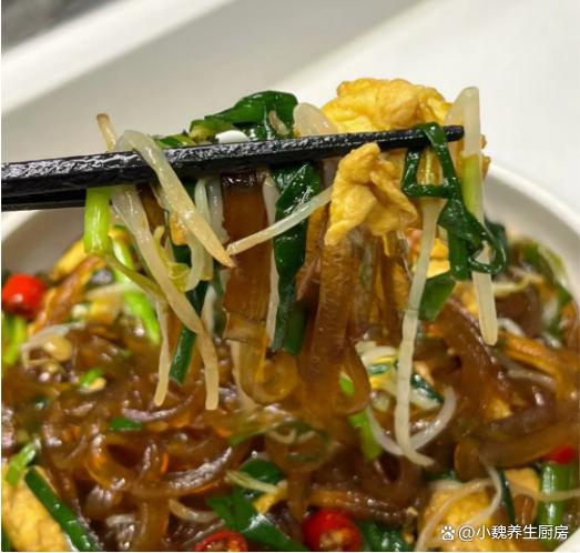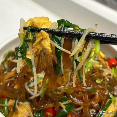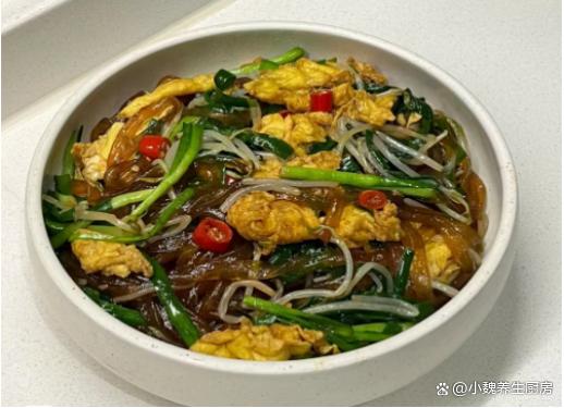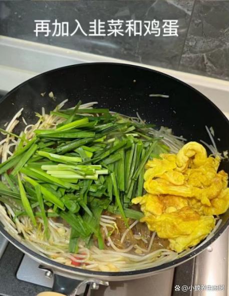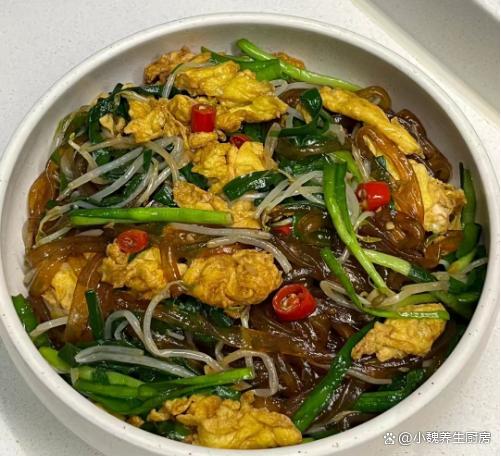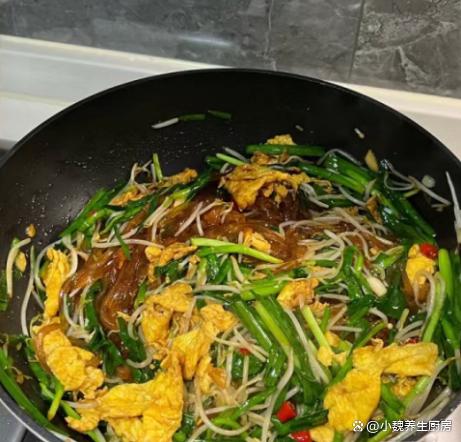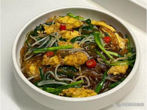 進入10月中后半段,我們仍然處于深秋,秋季馬上要離我們遠去,感覺現在天氣越來越冷,早晚溫差很大,不能每天吃涼性和辛辣的食物。現如今,我們生活條件更好了,每天都吃得起大魚大肉,但是不能天天吃,平常可以嘗嘗這道開胃小菜——韭菜豆芽粉絲炒雞蛋,菜色特別好看,香噴噴出鍋,大人孩子都愛吃。秋季,大魚大肉靠邊站,多給家人吃這菜,營養解饞,出鍋后香噴噴。  【韭菜豆芽粉絲炒雞蛋的食譜解析】 食材清單:選購新鮮韭菜一小把(韭菜是一年四季都可以吃到的蔬菜,葉片含有豐富的營養價值,男人一定要多吃,能夠呵護肝腎的健康,還可以幫助清潔腸道),選購紅薯細粉100克(紅薯粉是以紅薯為主要原材料制作而成的食材,口感非常Q彈,可以做成許多美食),小米辣幾個,豆芽菜120克左右,生抽和老抽少許,蠔油一勺,少許清水,土雞蛋幾個,半勺白醋,水淀粉少許,食用油少許,一丟丟食鹽,少許胡椒粉,其他佐料。 正確制作順序:第一步:提前準備好韭菜,豆芽菜,紅薯粉和雞蛋,先把幾個土雞蛋磕在碗里,用筷子迅速攪動,舀掉一層浮沫。第二步:蛋液用白醋去腥,加上少許清水或水淀粉,這樣能夠增強雞蛋的蓬松感,加上食鹽和胡椒粉,不要加雞精,迅速攪動一會兒,備用。第三步:將新鮮韭菜掐掉黃葉,切掉不新鮮的根部,反復用流水沖洗干凈,控干水分,切成若干小段。 第四步:提前把紅薯粉溫水泡發,起鍋燒一些清水煮沸,將紅薯粉放入鍋中稍微煮一會兒,撈出過涼拌浸泡,控干表面的水分。第五步:小米辣洗凈切成小段,大蒜去皮切成蒜末,豆芽菜掐掉根須,洗凈控干水分,準備好全部的配菜,開始烹飪這道韭菜豆芽粉絲炒雞蛋。 第六步:鍋中慢慢燒熱,加上適量食用油,蛋液倒入鍋中,中小火慢慢煎至成型,用鍋鏟炒散,盛出備用。