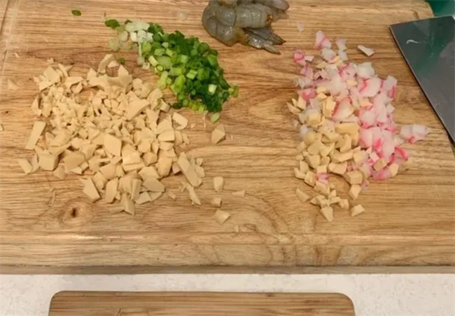 一、所需食材: 米飯 雞蛋 番茄醬 洋蔥或小蔥段 鹽 魚腸 蝦仁 黑胡椒