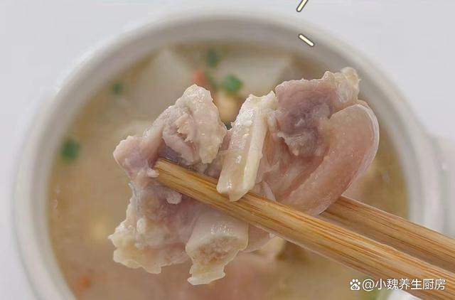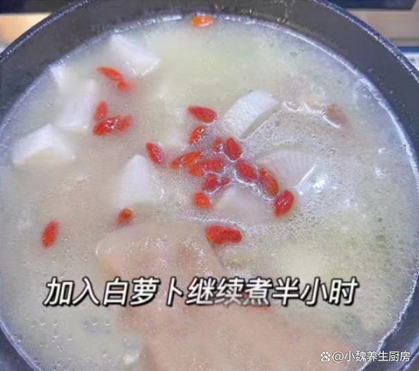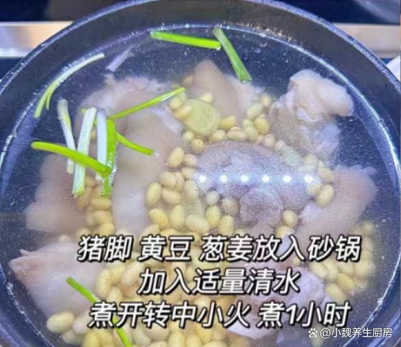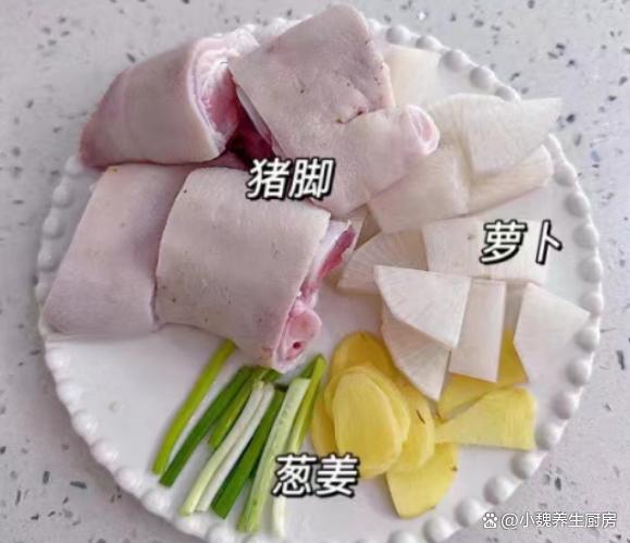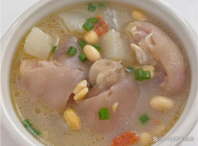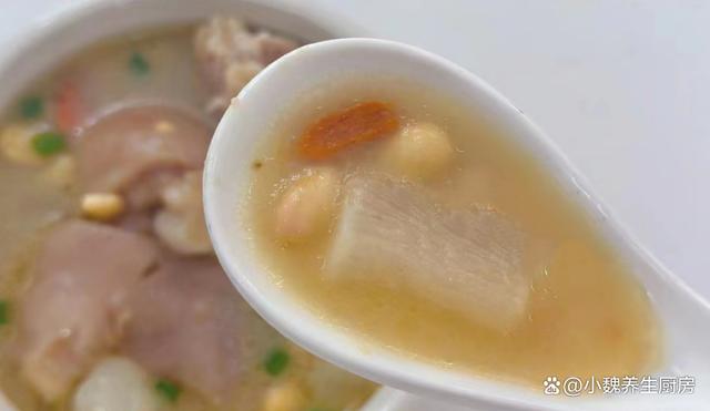 俗話說“食補不如藥補”,這句話一直流傳到現在,尤其是現在上了年紀,加上生活壓力大,氣溫逐漸降低,我們身體的抵抗力很差,身體非常困乏,肝火旺盛,整個人都沒有勁。秋冬其實是“黃金進補期”,許多長輩們稱為“貼膘期”,這個時候的飲食很關鍵,需要少吃涼性的食材,經常給家里人煲湯喝。今天為小伙伴們推薦一款家常湯——白蘿卜黃豆燜豬蹄湯,湯汁十分甜美,滋補身體,美容養顏,氣色越來越好。許多人沒有喝過這款白蘿卜黃豆燜豬蹄湯,一起跟著小編來了解下吧。“秋冬多喝湯,郎中不用幫”,平常多喝它,補足營養,健康度秋。  【白蘿卜黃豆燜豬蹄湯的正確做法】 食材清單:選購新鮮白蘿卜300克左右(白蘿卜是秋冬必吃的蔬菜,天冷了要多吃蘿卜,勝過吃人參,尤其是用來煲湯,湯汁鮮美甘甜,暖胃又驅寒,對身體有許多好處),選購優質豬蹄500克(豬蹄是優質的高蛋白食材,豬蹄口感Q彈,軟爛入味,我們家喜歡紅薯或煲湯,豬蹄湯特別溫補,讓肌膚越來越好),一小把黃豆,生姜20克,若干根香蔥,冷水和溫水若干,10克優質枸杞子,食鹽少許,食用油少許,半勺雞精,一丟丟胡椒粉,其他佐料。