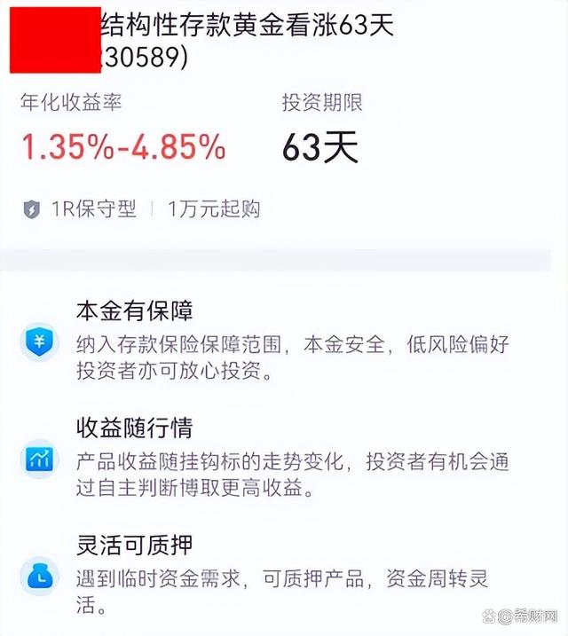 最后一種就是結構性存款。上方的幾種存款,利率都只能勉強達到4%以上,而且只有很少數的銀行才有,而結構性存款中收益率較高的,可以很輕松的達到4%以上,少數產品的最高收益率甚至能達到6%以上。 另外,收益率能超過4%的結構性存款,也不僅限中小銀行才有,大銀行同樣也有,所以相對來說也比較容易買到。