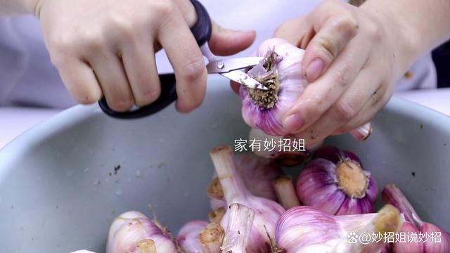 將大蒜外皮剝好后,我們還需要把它處理一下。要是大蒜的根部還留有很多根須的話,我們可以把根須給它剪掉。而大蒜桿我們也給它修剪一下,預留一點就可以了。