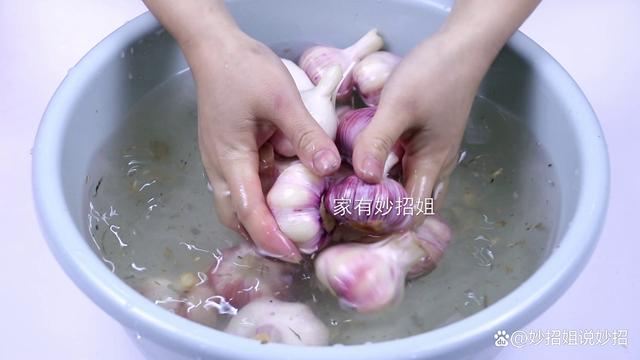 大蒜清洗干凈后,我們還需要把大蒜浸泡一下。這一步的目的,就是可以把大蒜的辛辣味,以及殘留的細菌之類的消滅掉,避免腌制的過程中大蒜出現腐爛的情況。當然,浸泡的時候不能用生水,要用涼白開,只需要準備大半盆的涼白開,在往里面倒入食鹽和白酒。食鹽可以稍微多倒一點,它能起到一個去除大蒜辛辣味的作用,而白酒可以殺菌消毒,將大蒜表面的細菌消滅。接下來,我們再把清洗干凈的大蒜倒入這個水中,讓它浸泡上一天一夜。