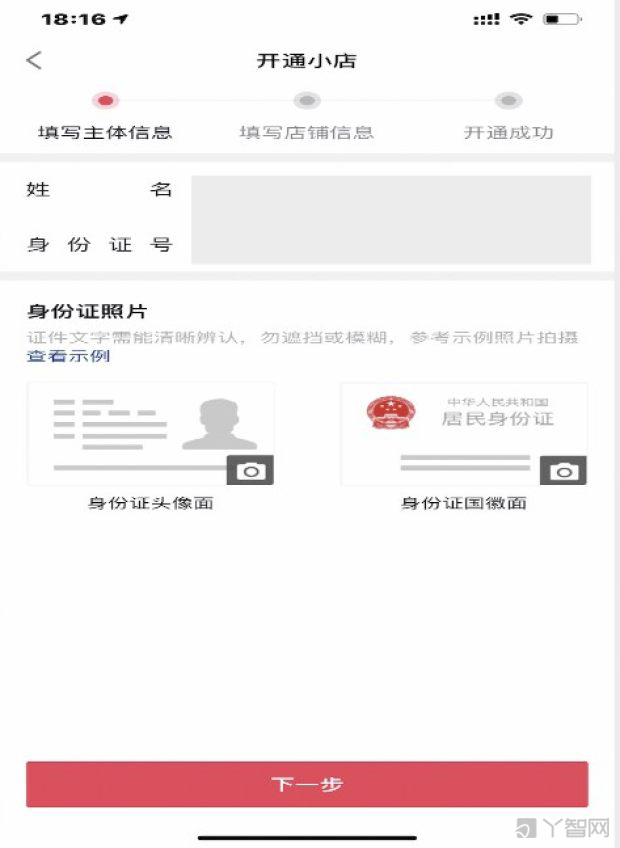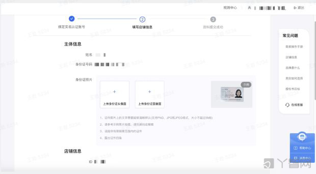 3)填寫店鋪信息 個人信息填寫:按照姓名和身份證號碼上傳身份證頭像面和國徽面照片