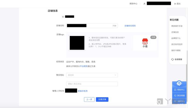 店鋪信息填寫:店鋪名稱,店鋪logo,經(jīng)營僅限一級類目為運功戶外、服飾內(nèi)衣、鞋靴和廚具下的部分子類目,售后地址和管理人手機號。