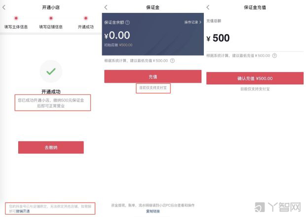 去繳納:按照個人身份證店鋪的保證金要求,商家需要充值500元。點擊充值后,通過支付寶掃碼支付。