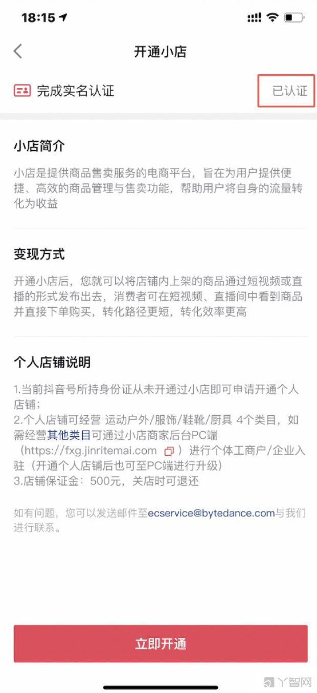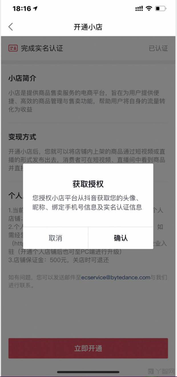 2)確認(rèn)實名認(rèn)證 完成抖音App賬戶實名認(rèn)證的賬號,閱讀小店介紹、變現(xiàn)方式和個人店鋪說明后,確認(rèn)獲取授權(quán)后開通小店