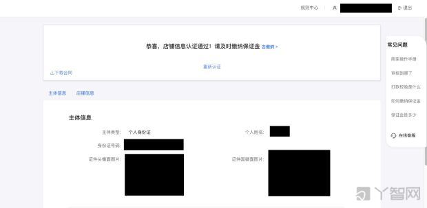 4)繳納保證金 繳納保證金:去繳納。 商家可以在此頁面下載合同協(xié)議,或者營業(yè)后在店鋪——合同協(xié)議下載合同。 若信息有誤或者想放棄入駐,商家可以選擇重新認(rèn)證。