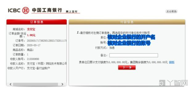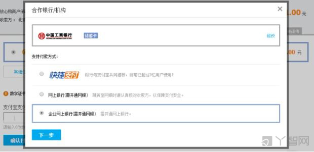 在支付付款方式中選擇[企業(yè)網(wǎng)上銀行(需開(kāi)通網(wǎng)銀)],點(diǎn)擊下一步