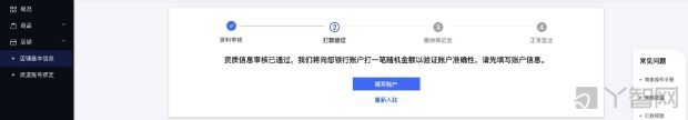 打款驗(yàn)證: 商家填寫(xiě)賬戶,根據(jù)個(gè)體工商戶商家的規(guī)則,填寫(xiě)賬戶信息(個(gè)體工商戶商家可選擇經(jīng)營(yíng)者及經(jīng)營(yíng)者個(gè)人銀行卡號(hào),或者營(yíng)業(yè)執(zhí)照名稱及名稱對(duì)公銀行卡號(hào)) 該賬號(hào)只用于驗(yàn)證,不用于結(jié)算。結(jié)算信息,請(qǐng)營(yíng)業(yè)后,在店鋪-支付方式設(shè)置中補(bǔ)充。