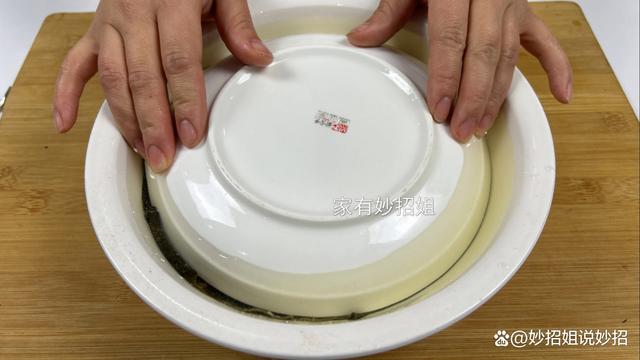 白醋倒好后,我們還需要拿個(gè)盤子壓在海帶的表面,這樣可以使海帶充分的浸泡在水中,以免出現(xiàn)表面沒被水泡到的地方還是干的情況。就這樣讓海帶浸泡上10分鐘。