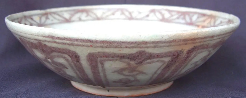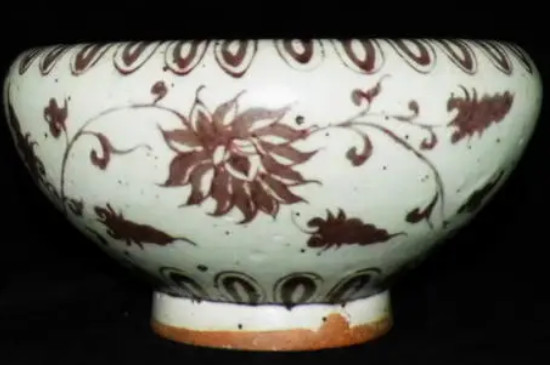 元代的釉里紅以氧化銅為呈色劑繪畫在瓷器的胚胎上,再蓋上一層透明石灰質青白釉,通過高溫燒制而成。元代的釉里紅呈色的主要色調是紅偏紫黑色,呈色為鮮紅顏色的瓷器很少,鮮紅顏色額的瓷器一般都是過度燒制而成。元代的釉里紅因為當時的燒制技術,通常燒制出來的瓷器呈色大多發黑、渙散。 2、造型