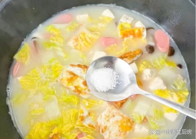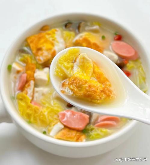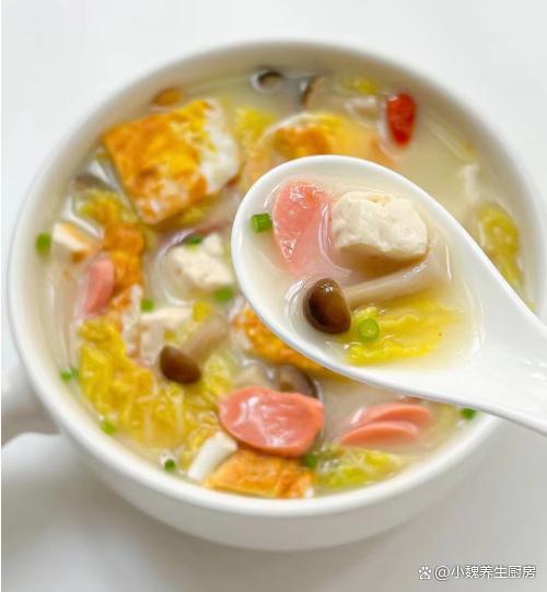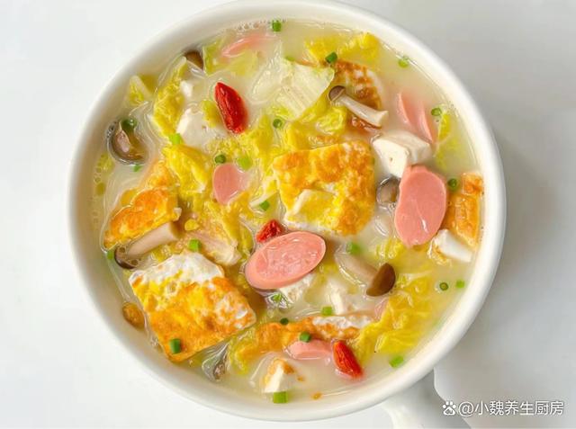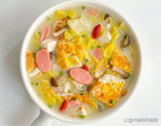 4:鍋底放入一些蔥花,加上適量開水煮沸,放入一些菌菇,火腿腸和嫩豆腐,等待湯汁煮到奶白色。 5:小火煮幾分鐘,放入娃娃菜一起煮,調入一小勺味極鮮,加上食鹽和雞精少許,最后調入半勺白胡椒粉,用鍋鏟翻動幾下,繼續燜煮一會兒。 6:最后放入洗凈的枸杞子,煮2分鐘左右,關火出鍋,這道娃娃菜菌菇煎蛋豆腐湯就可以食用了,我們家孩子超愛吃。 娃娃菜菌菇煎蛋豆腐湯是一道營養豐富、口感鮮美的家常湯品,其主要食材包括娃娃菜、菌菇、豆腐和雞蛋制作而成,湯汁乳白,富含大量的優質蛋白質和鈣質,營養更容易消化,讓身體的免疫力增強,保持身體的健康。
