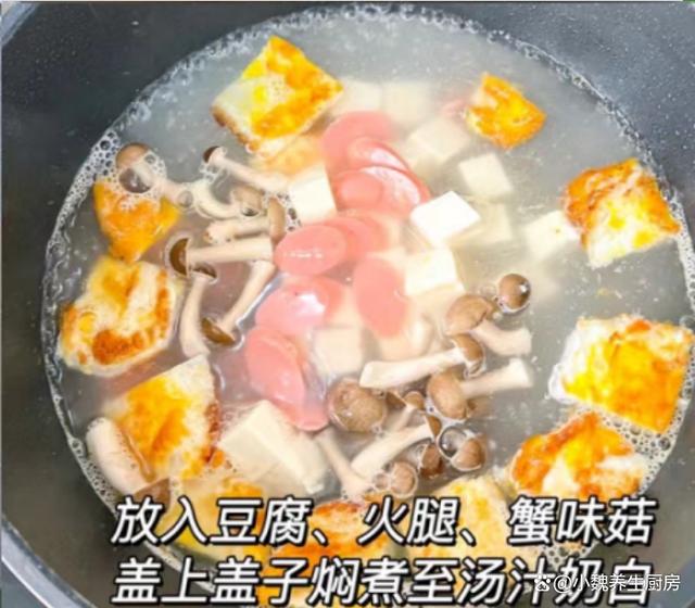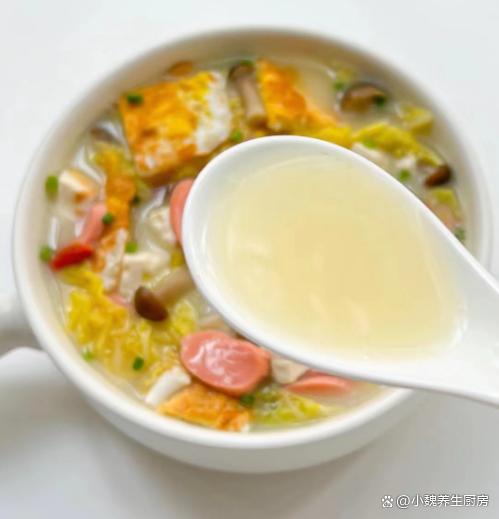 進入到深秋十月,稻谷都是金燦燦的,外面的樹葉都泛黃凋零,證明寒冷的秋天終于來臨了,我們要開始換上厚衣服,防止早晚溫差大,導致身體著涼感冒。明日是秋季很重要的節氣——寒露,寒露是二十四節氣之一,從這一天開始,天氣會慢慢變冷,溫度甚至會達到個位數,因為季節的改變,我們的飲食需要適當地調整。  許多南方人特別愛喝湯,比如說排骨湯,雞湯,蔬菜湯等等。今天分享我們家晚餐常喝的家常湯品——娃娃菜菌菇煎蛋豆腐湯,成本不高,鮮美十足,我們全家人都愛喝。明日寒露,多給家人喝這湯,順應時節,營養全面,不懂吃可惜了。 【娃娃菜菌菇煎蛋豆腐湯的具體做法】 www.ws46.com 準備一些食材:挑選新鮮娃娃菜150克(娃娃菜是白菜的品種之一,葉片含有大量的植物纖維和維生素,適合一些減肥者食用,幫助清潔腸道,減脂瘦身),新鮮雞蛋2個,少許植物油,兩碗冷水,一根雙匯火腿腸(建議選擇肉腸),蟹味菇80克左右,開水少許,香油幾滴,香蔥若干根,枸杞子12克左右,幾片生姜,250克嫩豆腐或內酯豆腐,食鹽少許,雞精半勺,一小勺味極鮮,其他。 正確做法: 1:提前準備好娃娃菜,幾滴,菌菇和嫩豆腐,先把嫩豆腐放在大一點的器皿里,加上清水浸泡,沖洗干凈,切成若干塊狀,備用。2:蟹味菇切掉根部,用清水沖洗干凈,或者將菌菇焯水處理,娃娃菜切除根部,葉子切成若干塊狀,瀝干水分即可。 3:香蔥去掉蔥須洗凈,切成一些細蔥花,火腿腸斜切成若干片狀,鍋底調入適量植物油,等待油溫慢慢燒熱,兩個雞蛋打入鍋底,慢慢煎至定型,煎至色澤金黃,用鍋鏟分成小塊。