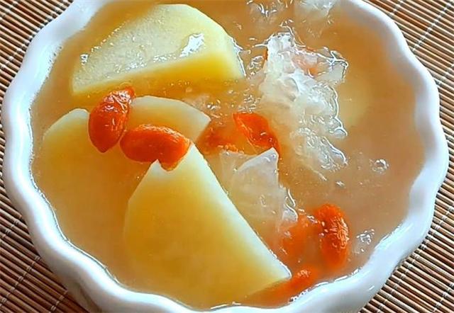 接著,將白木耳和土豆放入鍋中,加入適量的清水,大火煮沸后轉小火慢燉。燉至白木耳和土豆變得軟糯,加入適量的牛奶和冰糖,繼續燉煮至冰糖溶化即可。